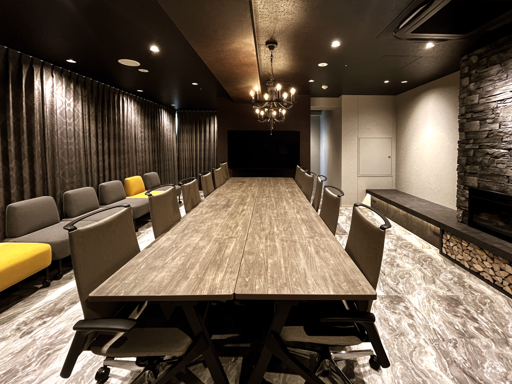 お客様との打合せを重ね、全体コンセプトを「映画に出てくる中世のお城」としてデザイン。エントランスは洞窟の中を再現し、オフィスらしくない遊び心があふれた空間としました。来客の際は、どなたも大変驚かれるようです。中に進むとお城の回廊に繋がっています。メインの会議室は、電気暖炉とレンガを取り入れたいというご要望のもと、コンセプトに沿ってお城の談話室をイメージしました。什器は全て可動式のもので構成されているため、自由な配置での利用が可能になります。シチュエーションに合わせて雰囲気を変えられるよう、照明にもこだわりました。アンティークな雰囲気にコーポレートカラーのイエローが目を引く、ピンクル様ならではの空間が完成しました。